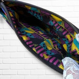 Closure: Gunmetal zipper with Jack Skellington zipper pull on the side zipper. Metal snap button closures on card slot flap and side pocket.