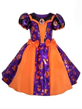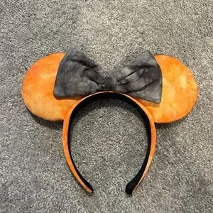 Disney-themed plush mouse ears in bright orange. Large gray bow sits between the ears. Padded headband for comfortable wear. Fun accessory for costumes and dress-up.