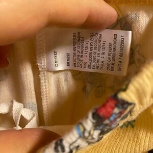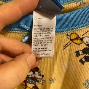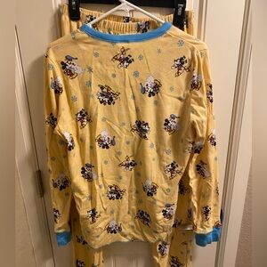 Up for auction is a ladies size large pajama set from Disney. It is yellow with blue trim and Mickey Mouse with a snowman pattern. It comes with a pair of jogger pants and a long sleeve top. The top measures 21 inches across the front of the chest, armpit to armpit, and 25 inches from the top of the shoulder to the bottom of the shirt. The pants have an elastic waistband. They measure 27 inches around the waist (it will stretch more with the elastic waistband ) and 30.5 inches in the inseam. The rise is approximately 12.5 inches long. Great shape! Cute!
