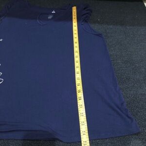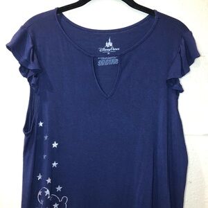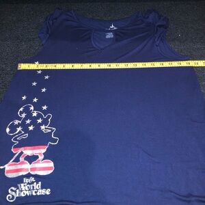Disney Park Dark Blue Mickey Mouse Epcot Showcase. There is some ruffles around the sleeves, as shown in photos above. Mickey Mouse is the color of the American Flag, with silver stars. In great preowned condition. No visible signs of wear. Feel free to make a reasonable offer!