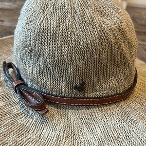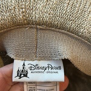 Disney Parks Authentic Woven Adult Hat. Leather slim bow hat band and Mickey button. Woven material-not sure of content as there’s no fabric tag