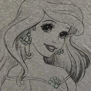 This pre-owned, in excellent condition, short-sleeve poncho-style top from Disney Parks features a charming sketch of Ariel from The Little Mermaid on the front. The grey fabric has an all-over silver shimmer, adding a magical touch. Made from a comfortable blend of 69% polyester, 27% viscose, and 4% elastane, it's perfect for a day at the parks or casual wear.