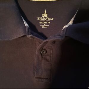 Disney Parks Authentic Navy Polo size Small gray binding inside collar and at 1” side splits in hem.