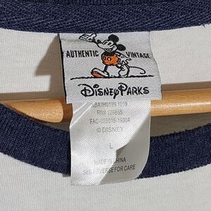 Classic Disney Parks tee with vintage Mickey Mouse design. Features navy trim and white fabric.