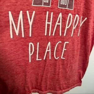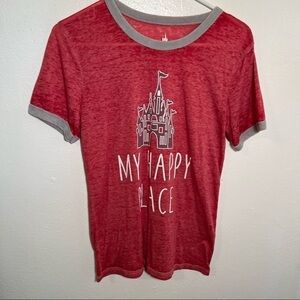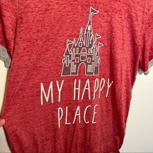 Great condition. Disney Parks. Burnout t-shirt. Red with light gray cuffs and neckline. Graphic says my happy place with castle. Crewneck. Short sleeve. Size small. 56% cotton, 44% polyester. Pit to pit laying flat 16” Shoulder to hem 25.5” Sleeve (pit to hem) 4”. All measurements are approximate and taken lying flat. Smoke free home. No trades, offers welcome.