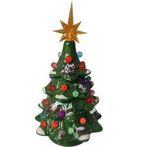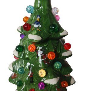 This decorative ceramic Christmas tree features beloved Disney characters, vibrant light-up ornaments, and a striking golden star topper. Designed for festive displays.is like new without box from smoke and pet free home