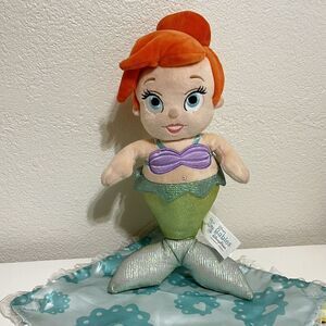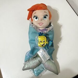 Disney Parks Disney Babies Ariel in a Blanket Plush Doll The Little Mermaid. Adorable little baby Ariel plush from the Disney Babies Line from the Disney Parks. Baby Ariel is wrapped in a blanket with Flounder. We purchased this is Disneyland. My daughter played with it in the park and has mostly just sat in a toy bin for years. The nose on Ariel is a little dirty and some normal wear and tear, but still has a ton of life left. Please see the pictures.