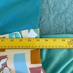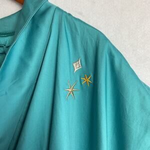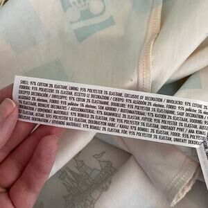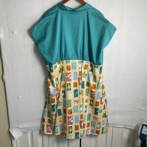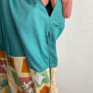 -Features: Retro style "fit and flare" dress with teal short sleeve top featuring embroidered diamonds on the left chest, the bottom of the dress is a beige base with multicolor blocks that showcase different aspects of magic kingdom/disneyland themes. This is the "Fantasy" dress from The Dress Shop.