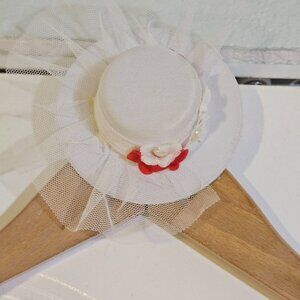 Includes the coordinating Mary Poppins mini hat hair clip—one of the two clips on the back is missing, but it still attaches securely. The glue on the hat is also yellowing on the back. This clip did not come with the original dress so is just a bonus for you! :)