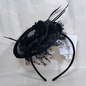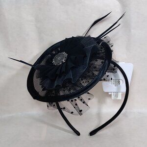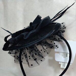 Mourn the 999 dearly departed ghosts of Disney's Haunted Mansion attraction with this fashionable funeral fascinator headband. The thin headband is topped with a layered fascinator with black flocked polka dot netting, a wire saucer shaped base topped with thin black faux feathers and different ruffled fabrics accented by a silver tone (plastic) wallpaper cameo.