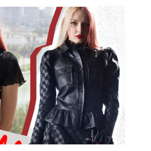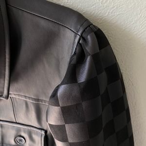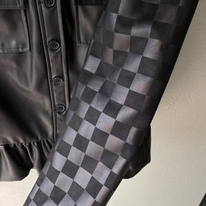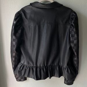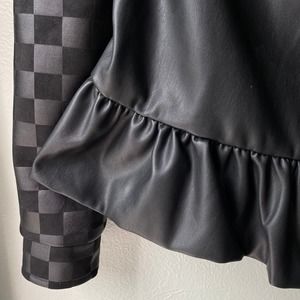 If you worship fine fashion, you'll simply adore this simulated leather jacket with designer detailing, ruffled hem, and checkerboard sleeves, inspired by Disney's live-action film Cruella.