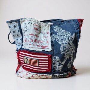 Disney Parks exclusive tote bag — “I Love Disney" tote features a patchwork design in classic red, white, and blue, adorned with stars and stripes. Crafted from what appears to be a soft, "old cotton" style fabric, this bag has a wonderfully relaxed and lived-in feel. The design prominently displays "I ❤️ DISNEY" in a distressed patriotic font, along with a "D" on an American flag motif.