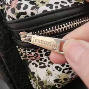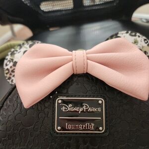 Disney Parks Loungefly mini backpack with a leopard print and pink bow. Features black textured material and a front zip pocket. Adjustable Straps. 12"×8" Silver Hardware
