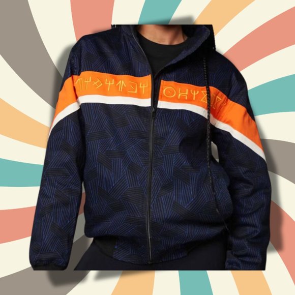 Make a fierce statement with this epic Black Panther jacket! The design features an all-over geometric print, Wakandan lettering across the front and back, and the Black Panther logo on each arm.