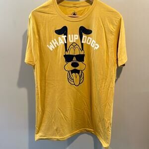 New with tags (NWT) authentic Walt Disney World Park merchandise Pluto graphic short sleeve cotton tee. Sizing is a men’s medium but is unisex. Tee is classic yellow/gold keeping with Pluto the Disney character. Simple screen print has slight distressing, giving it a vintage or retro look. Pluto graphic in black wearing sunglasses that says: “What Up Dog?” in white. Collection was created specifically for Walt Disney World Resort and Disneyland Resort. Approximate measurements Armpit to armpit 20” Length 28.5” From a smoke-free home. 100% cotton. Style tags: Disney outfit Walt Disney World Resort Disney trip Pluto classic Mickey & Co. original character graphic classic natural materials relaxed comfortable casual Disney Parks merchandise retro vintage vacation travel dog lover unisex