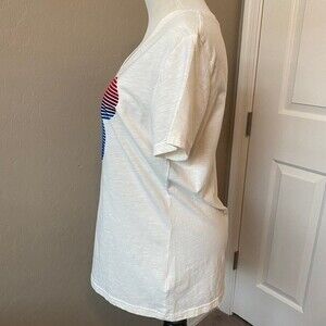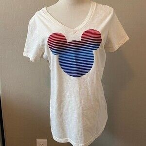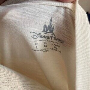 Size large in euc cream color with flocked red and blue Mickey on it. Part of the Americana collection at Disney parks a few years ago. Worn maybe once or twice perfect now that all the parks are open again.