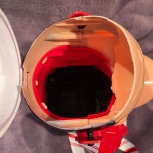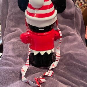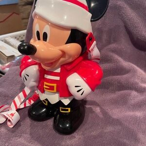 Disney Parks Mickey Mouse Christmas Popcorn Bucket Santa Elf Stripe Suit, gently used, 14" tall, smoke free home #7983
