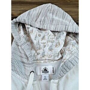 This product is a white zip-up hoodie featuring Mickey Mouse and the iconic Cinderella Castle, designed specifically for women in size large. It is an officially licensed Disney item, making it a perfect collectible for adults who are fans of the Disney franchise. The hoodie combines the magic of Disney with a trendy and comfortable outerwear option, suitable for everyday wear.