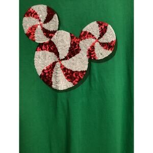Design: The green top features a Mickey Mouse icon made of red and white "peppermint" or candy cane swirls, potentially with sequins. The red pants have an allover print of Mickey icons, candy canes, and other festive images.