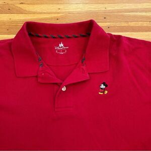 Disney Parks Mickey Mouse red embroidered short sleeve polo shirt. Collared. 2 buttons. Armpit to armpit 23 inches. Length 26 inches. 60% cotton, 40% polyester. Size large. Good condition!