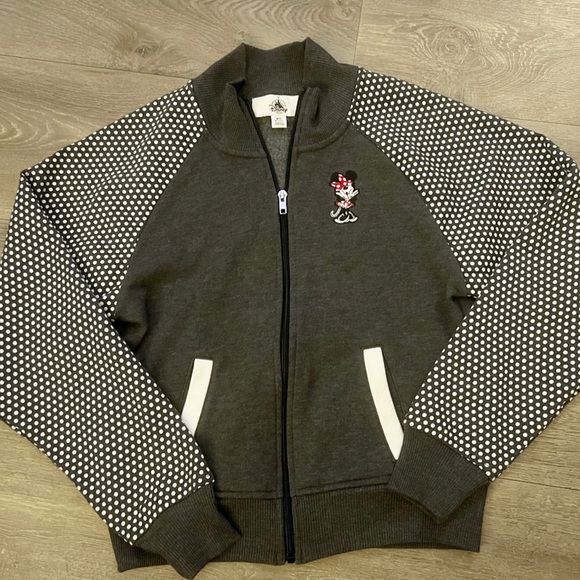 Disney Parks Minnie XS Embroidered Logo Grey & Polka Dot Zip Up Sweatshirt
