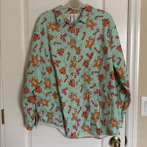 In very good pre-owned condition. 100% cotton button down shirt and elastic waist matching pajama pants with pockets. Both are size 1x. Measurements lying flat are approximately 29” in length and 26” pit to pit for the shirt and 4” in length and 20” across the waist unstitched and the inseam is approximately 28”