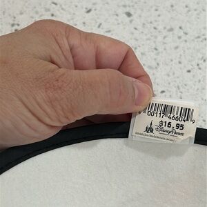 Mickey Mouse themed all over print on the felt hat. The ears each have a silhouette of Mickey in felt. One is green and the other is blue.