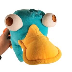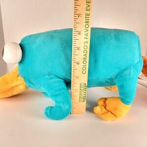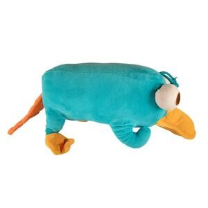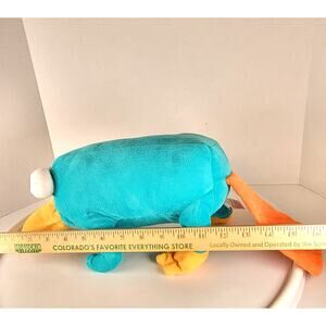 Authentic Disney Parks plush featuring Perry the Platypus from Phineas and Ferb. Measures about 15 inches long from bill to tail. Soft teal body with orange bill, feet, and tail. Embroidered eyes and tag marked Disney Theme Park Merchandise. A fun collectible for Disney and Phineas and Ferb fans.
