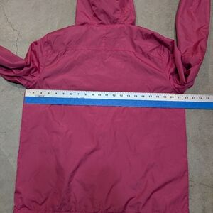 Stylish pink windbreaker with a hood. Features blue accents and zipper details.
