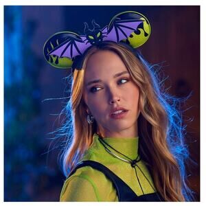 Summon the dark sorcery of the "Mistress of all Evil" in Maleficent's mouse ear headband with fearsome winged dragon bow and glittering flame ears, all intended to keep true love's kiss far, far away.