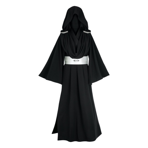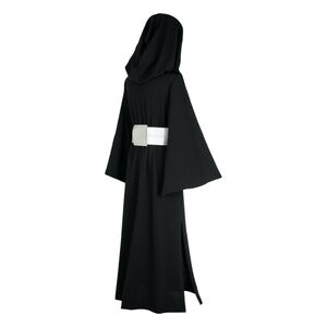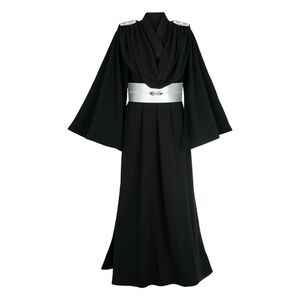 Get into character as you prepare for your next Star Wars adventure with this dramatic black cosplay dress. Inspired by the costumes seen on Dryden Vos's yacht in Solo: A Star Wars Story, it features bell sleeves, detachable hood accessory, and bold simulated silver leather belt so you'll become the hero of your exciting Star Wars mission
