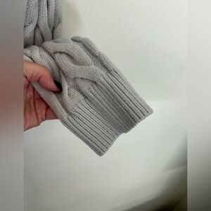 This is a very soft sweater with substantial weight. It is a lighter gray than appears in the pictures. The stock photo is reflective of the actual color.