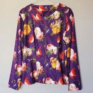Disney Parks Tinkerbell Fairy Zip Front Jacket in wonderful condition. May be mistaken for brand new. Full zip front, peplum hem, stretch, long sleeves, adorned with tinkerbell fairy; butterflies and roses on a purple background. This would also be perfect for a Lakers fan with the purple and gold!