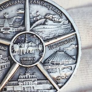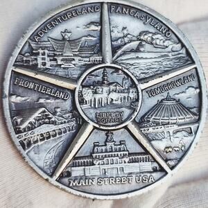 Capture the nostalgia of Walt Disney World with this rare Disney Parks Vintage Pendant Keychain, still in its original plastic box! A true collector's item, this silver-toned medallion showcases six iconic park features: Adventureland, Fantasyland, Frontierland, Liberty Square, Tomorrowland, and Main Street USA. Stamped "Walt Disney Productions" (used from 1939 to 1986), this pendant is a treasure trove of Disneyana, celebrating the park's extraordinary legacy. The intricate craftsmanship and timeless design make it perfect for any Disney fan. Own a piece of Disney history—add this rare vintage souvenir keychain to your collection today!