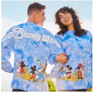 Mickey Mouse and the gang are pictured enjoying a fun day out at The Happiest Place on Earth on this Disney Celebration Crew. Featuring an allover tie-dye wash, the whimsical design shows Mickey, Minnie, Donald, Daisy, Pluto, and Goofy looking out from the front of this pullover sweatshirt while they're seen from the rear on the back which also includes ''Walt Disney World" spelled out in large puff ink across the shoulders.