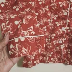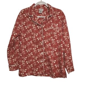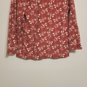 Cozy red pajama top with Mickey Mouse print by Disney Parks, US size medium. Features white piping and a chest pocket. Perfect for Disney fans.