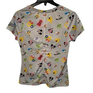 Brand new with tags Disney Parks short sleeve graphic tee shirt in a womens size small in gray with a printed repeating pattern design of Mickey, Minnie, Pluto, Goofy, Donald, the four theme parks, the year 2020, and Chip & Dale.