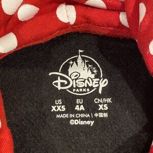 This precious Sweatshirt features a black hoodie with Minnie mouse ears and a large polkadot red bow. It has red polkadot lining inside of the hood. It has a screen print of Minnie mouse's body on the front and back. This sweatshirt was purchased in Disney World and worn only once. Size XXS (4)
