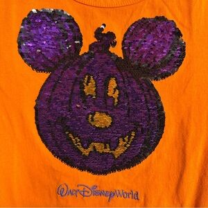 Youth size large Disney Parks Halloween Mickey tee with flip sequins. Orange tee with purple sequins. Featuring Mickey Mouse as a pumpin, this tee is great for fall! 60% cotton/40% polyester.