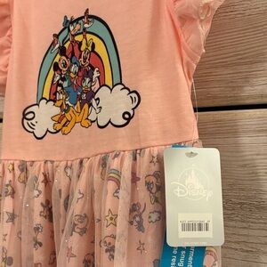 Charming peach dress with Disney characters. Mickey and Minnie. Features ruffled sleeves and playful print. Ideal for casual wear.