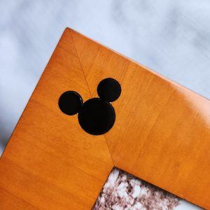 Mickey icons are carved into the corners of this elegant wooden frame. The beveled design provides a suitably stylish setting for a happy memory of your Park visit.