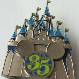 This unique collectible Disney pin features Cinderella's Castle and helped celebrate Walt Disney World's 35th Anniversary which occurred in 2006. Cinderella Castle is featured with the Mickey icon in the center as a pin on pin. A dangle is also featured which says Walt Disney World in green lettering. this beautiful pin is is brushed pewter / silver and has green and blue flags and turrets. This pin measures about 2" wide, see pictures for size and condition.