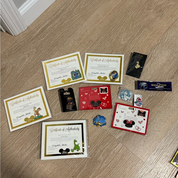 Charming Disney pins some with certificates. 1 has been used the other 11 have never been opened