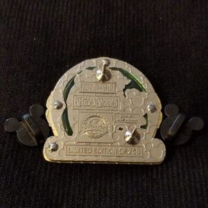 September 2015 from the DS Online's Park Pack. Each month four similar LE 750 mystery pins are released with small variations. This version features Belle and Beast in a gold frame in front of a teal stained glass (translucent) background. The frame resembles the mirror in the movie with a rose at the top and accents on the sides. At the bottom the words, Disneys Beauty and the Beast are stamped into the frame. Inside the frame, Belle and Beast are dancing. Belle is wearing her signature yellow dress and Beast is wearing his blue jacket. They are gazing into each others eyes
