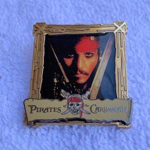 This pin features a framed Captain Jack Sparrow. Below the pin reads, "Pirates of the Caribbean"; this part is pin on pin. Captain Jack Sparrow is played by Johnny Depp. Pin is 1 & 1/2 inches by 1 & 5/8 inches.
