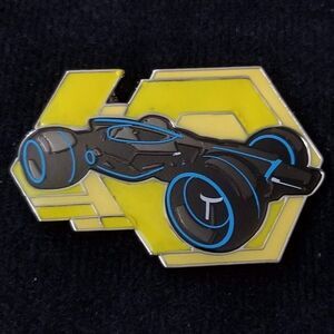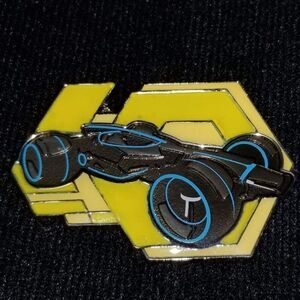 This pin features a black with blue accents light runner vehicle. Behind the light runner is light yellow and dark yellow background.