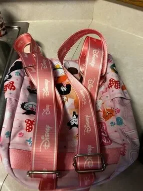 Adorable pink mini backpack with playful Disney cat illustrations. Features multiple colorful cartoon cats and paw print motifs. Front zip pocket for small items. Fun, kid-friendly accessory.