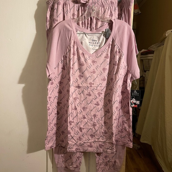Charming pink pajama set with Mickey Mouse script. Soft and comfortable for bedtime.