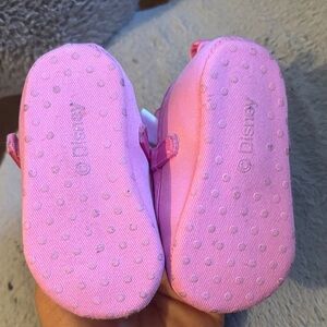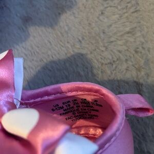Charming Disney baby shoes in pink. Features a playful Minnie Mouse design and a large bow accent. Ideal for little feet.