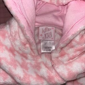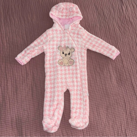 This charming Disney one-piece footie in a lovely pink shade features an adorable bear appliqué on the front. Made from a soft, cozy fabric, it offers full-length coverage for warmth and comfort. The convenient front closure ensures easy dressing.